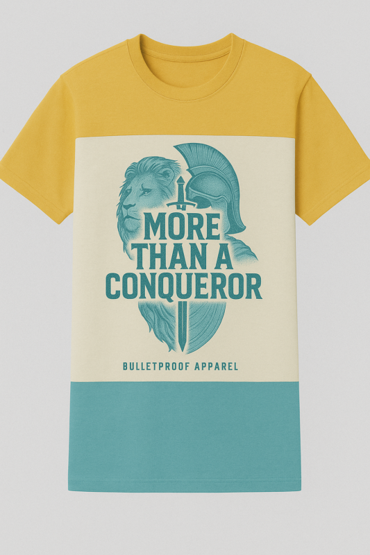 Wear your victory with confidence in the Bulletproof “More Than a Conqueror” T-Shirt. Inspired by Romans 8:37, this bold design declares your unshakable faith and unstoppable spirit. Available in three striking colors — burnt orange, blue, and yellow — it’s crafted for believers who know they are called to rise above every challenge. Soft, durable, and effortlessly stylish, this tee is more than apparel — it’s a statement of who you are in Christ.